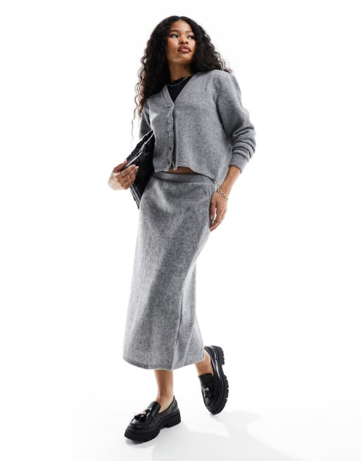 Vero Moda Petite button through cardigan and midi skirt co-ord in grey melange