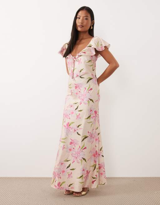 Vero Moda Petite – Gräddvit, rosablommig maxiklänning i satin med utsvängda ärmar