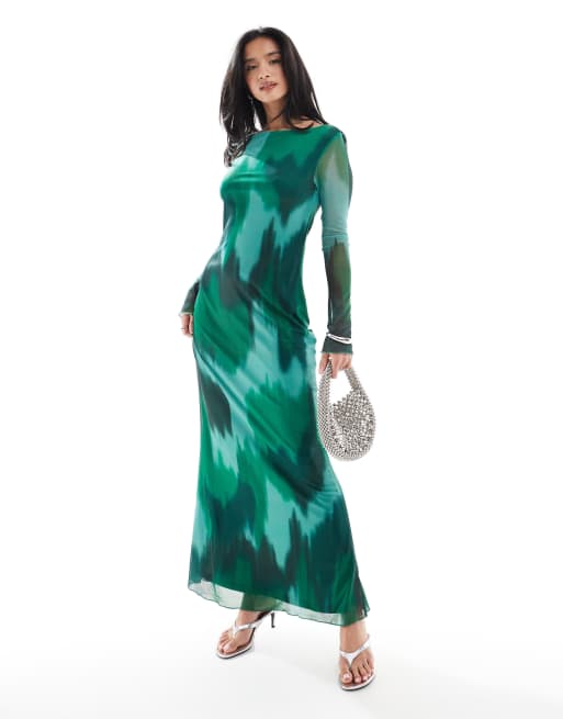 Vero Moda Petite – Mörkgrön, långärmad maxiklänning i mesh med abstrakt mönster