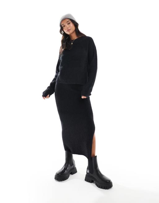 Vero Moda Petite – Svart, fluffigt set med tröja och midikjol