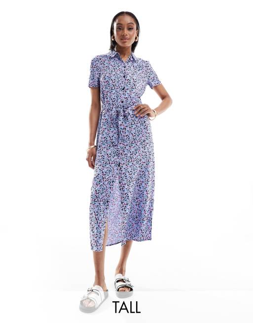 Vero Moda Tall – Blå, blommig skjortklänning i maxilängd med knäppning