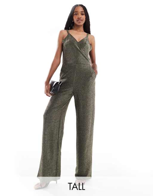Vero Moda Tall – Svart och guldglittrig jumpsuit med vida ben och smala axelband