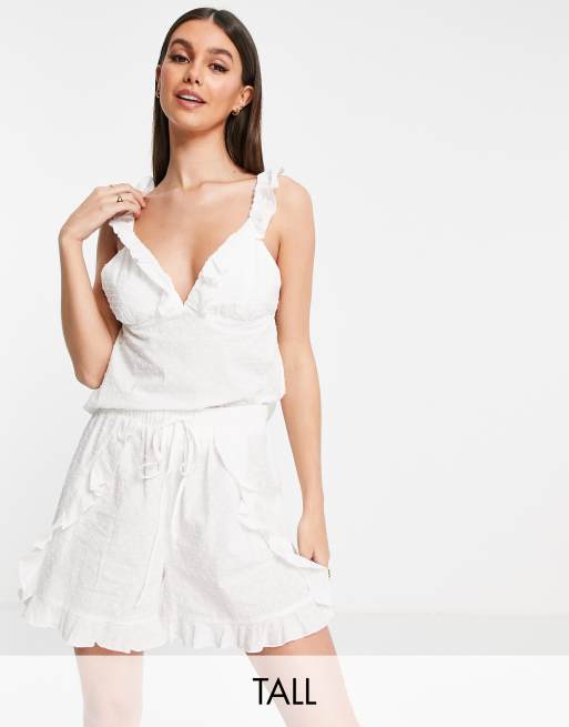 Vero Moda – Tall – Vit dobbyvävd pyjamas i bomull med volangdetalj