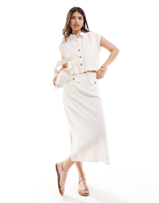 Vero Moda – Naturvitt set i linnetyg med kort skjorta och midikjol