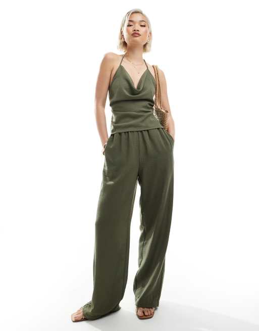 Vero Moda – Örtgrönt set i linnelook med topp med draperad ringning och byxor
