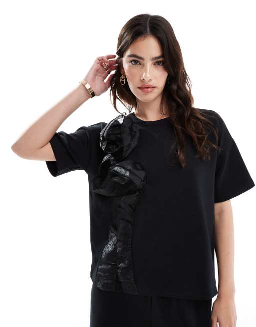 Vero Moda – Svart, kortärmad t-shirt i sweatshirttyg med 3D-rosor, del av set