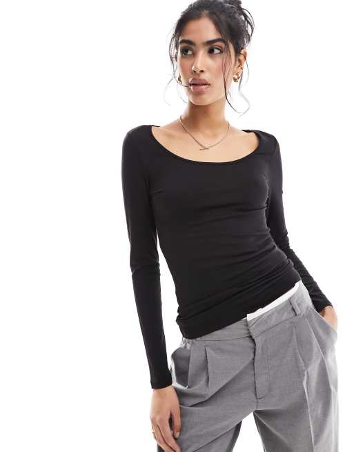 Vero Moda – Svart, mjuk, långärmad topp med djup halsringning