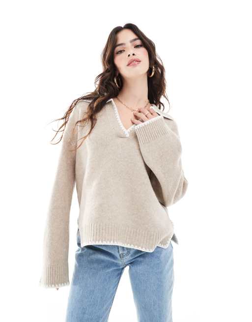 Vila – Beige tröja med v-ringning, öppen krage och kontrastsömmar