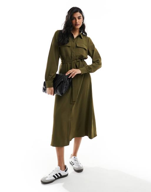 Vila – Khakigrön skjortklänning i midimodell med knytning i midjan