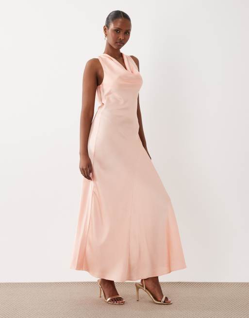 Vila – Persikofärgad maxiklänning i satin med halterneck och draperad ringning