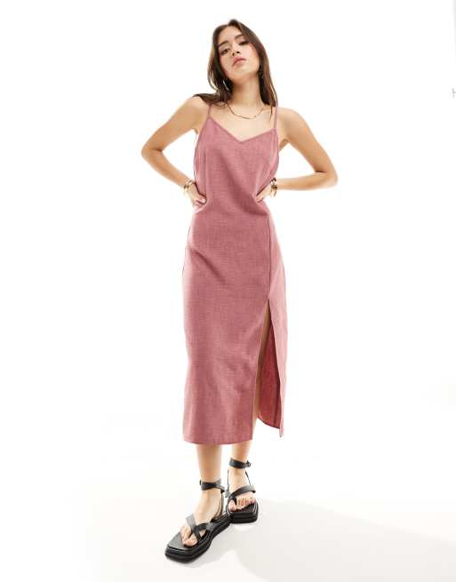 Vila – Rosa midiklänning i linnestil med smala axelband och slits framtill