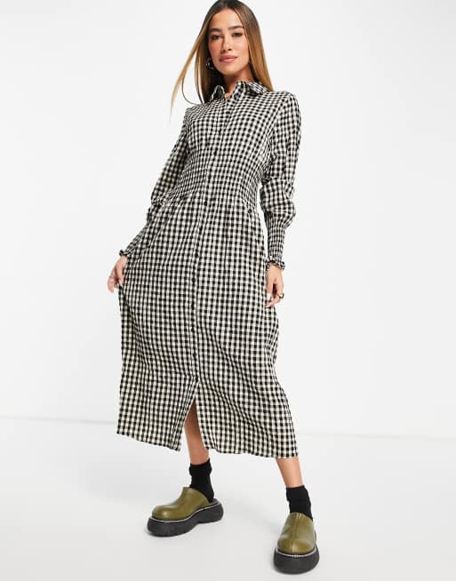 Vila – Rutig skjortklänning i midilängd med smockad midja