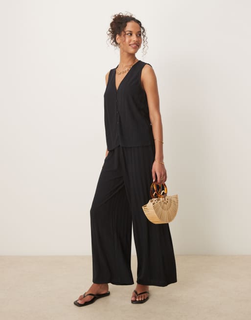VILA – Svart, tunt ribbstickat set med topp och byxor