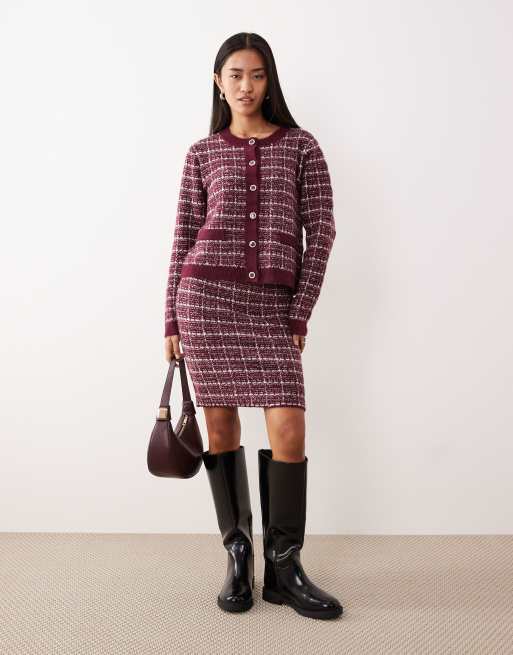 VILA – Vinrött, rutigt set i bouclé med kofta och stickad kjol