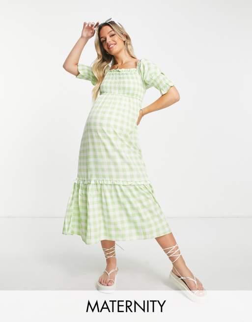 Violet Romance Maternity – Grön, ginghamrutig midiklänning med smockad byst