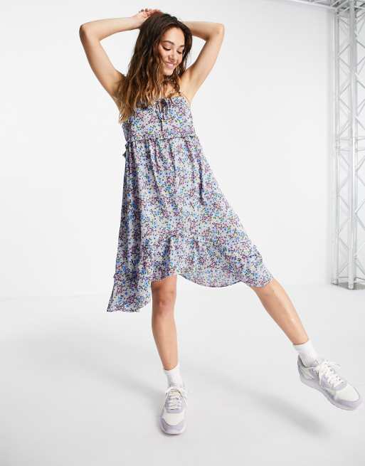 Violet Romance – Blommig miniklänning med asymmetrisk fåll och smala axelband