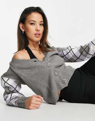 Violet Romance – Grå, stickad kofta med argylmönstrade ärmar