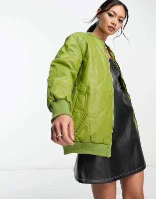Violet Romance – Olivgrön, quiltad bomberjacka i läderimitation