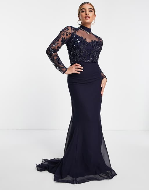 Virgos Lounge – Marinblå maxiklänning med utsmyckning, hög krage och släp