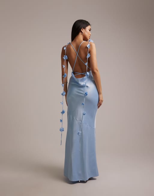 Wander Doll – Aria – Ljusblå maxiklänning i satin med draperad ringning, blomdetaljer och korsade band baktill