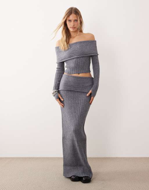 Wander Doll – Mollie – Mörkgrå, ribbstickad maxikjol med bred, nedvikt midja och textur, del av set