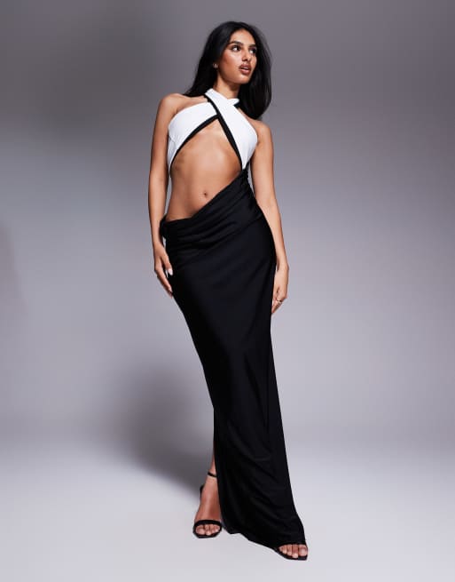Wanderdoll – Maddison – Svart och vit maxiklänning med åtsmitande design, halterneck, korsade band framtill och draperad sida, exklusivt hos ASOS