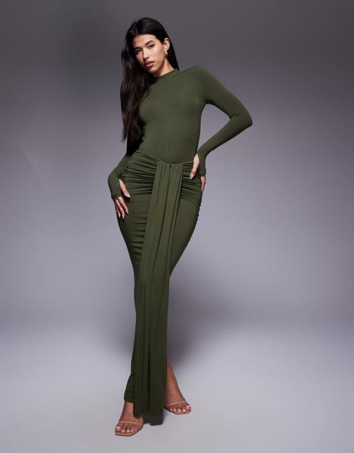 Wanderdoll – Nara – Olivgrönt set med åtsmitande body med hög krage och långa ärmar och maxikjol med drapering framtill