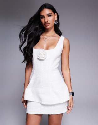 Wanderdoll – Sophia – Vit, strukturerad miniklänning i bouclé med fyrkantig halsringning, paljetter och blomma