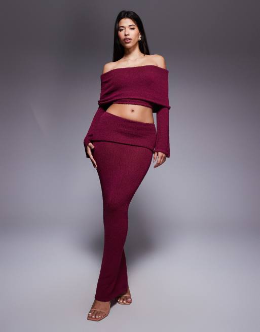 Wanderdoll – Yasmin – Mörkrött set med stickad topp i bouclé med nedvikt bardotringning och utsvängda ärmar och maxikjol