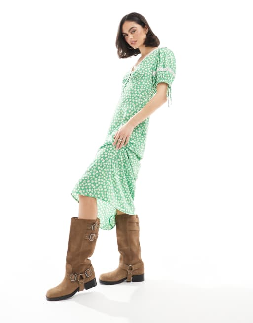 Wednesday's Girl – Grön, småmönstrad tea-klänning i midaxilängd med spetsdetalj