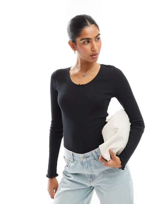 Wednesday's Girl – Svart, pointellestickad body med djup halsringning och blomma