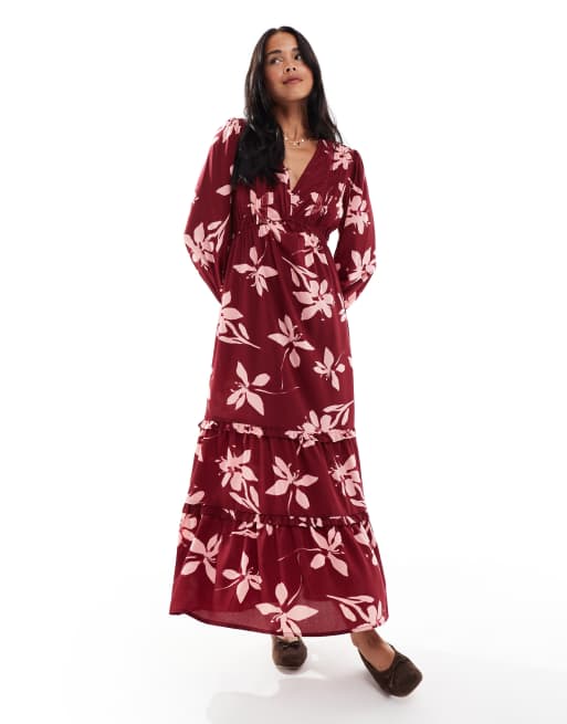 Wednesday's Girl – Vinröd, blommig midaxiklänning med djup halsringning