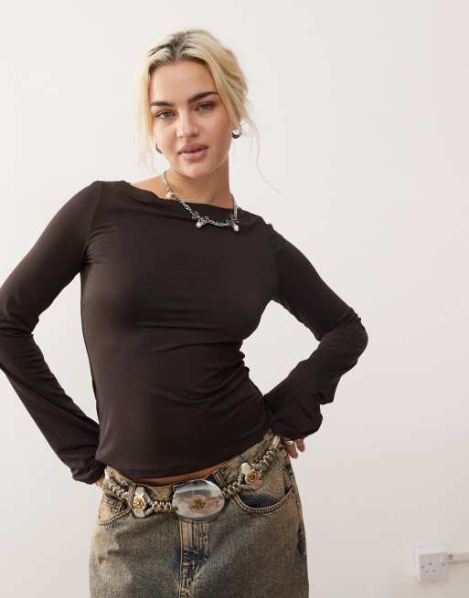 Weekday – Annie – Mörkbrun t-shirt med långa ärmar och båtringning