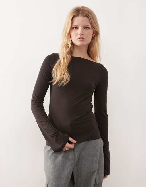 Weekday – Annie – Mörkbrun topp med båtringning och långa ärmar