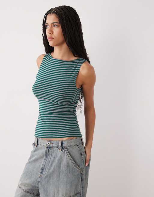 Weekday – Annie – Mörkgrön- och grårandig, ärmlös och mjuk topp med båtringning, exklusivt hos ASOS