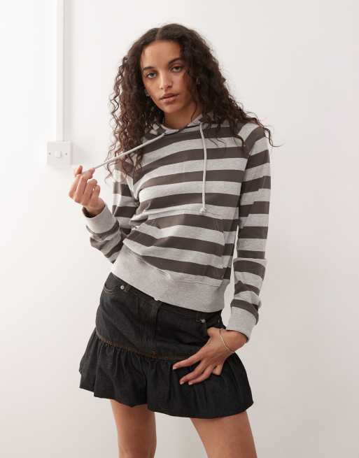 Weekday – Grå och brunrandig huvtröja med krympt passform