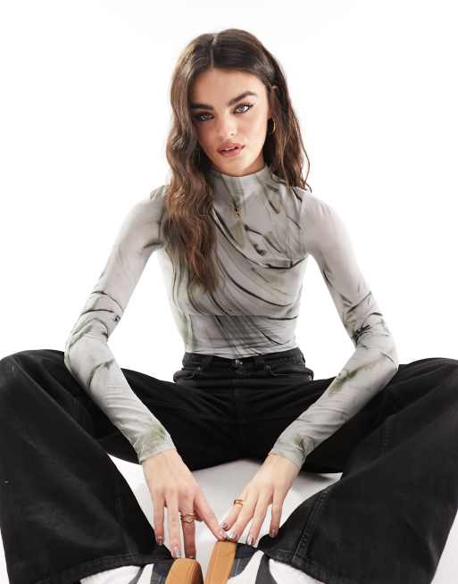 Weekday – Grå topp i mesh med hög krage och abstrakt mönster