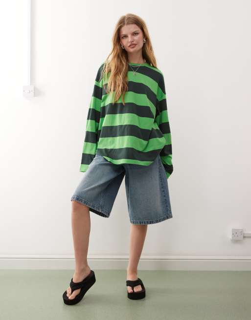 Weekday – Grön, randig t-shirt i oversize med långa ärmar