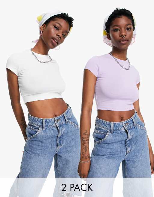 Weekday – Sabra – Vit och syrénlila, kort t-shirt i bomull, 2-pack – MULTI