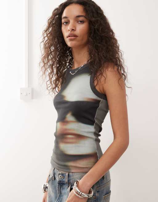 Weekday – Svart, ribbat sportlinne med tryck med blurrigt ansikte