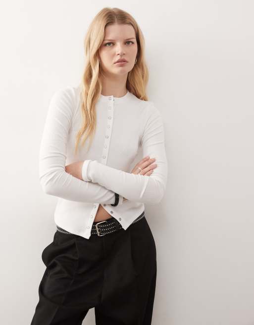 Weekday – Vit, långärmad topp med smal passform och knäppning framtill