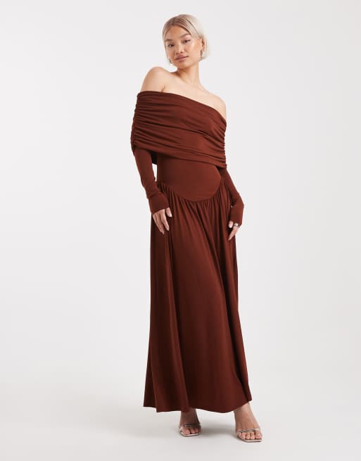 WeWoreWhat – Vinröd midiklänning med bardot-ringning och rynkning