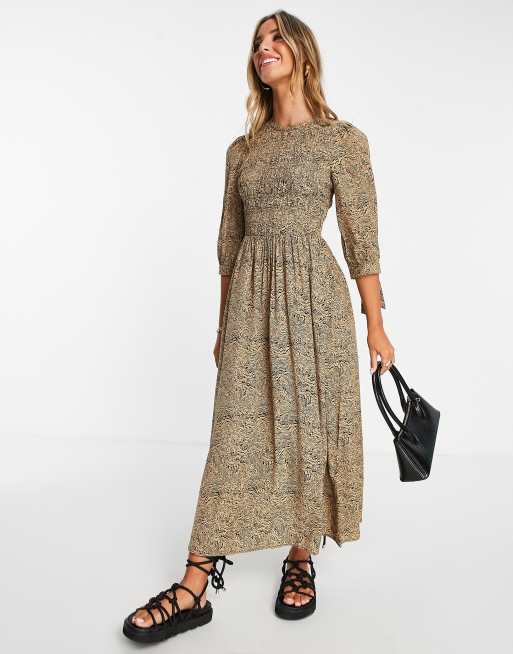 Whistles – Vågigt djurmönstrad, smockad midiklänning