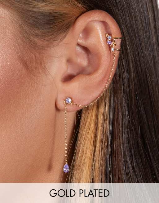 With Bling – Exclusive – Guldpläterat stiftörhänge och öron-cuff med lavendelfärgad halvädelsten och kedja för vänster öra
