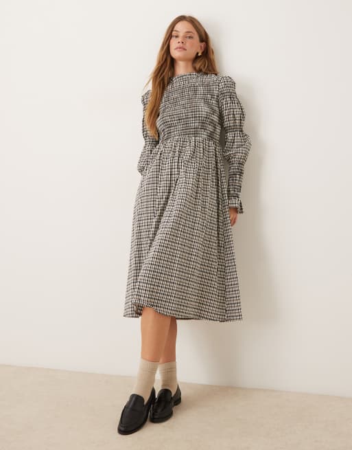 YAS – Beigerutig, smockad midiklänning med långa ärmar