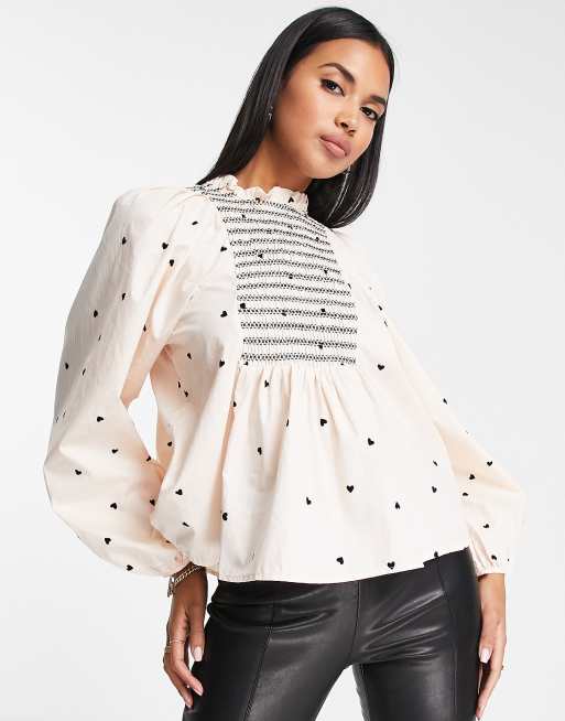 Y.A.S – Gräddvit smockad blus med hjärtmönster