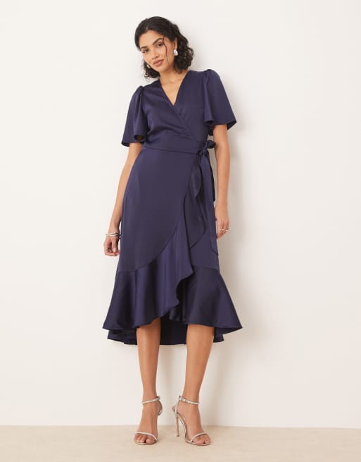YAS – Marinblå midiklänning i satin med omlottdesign