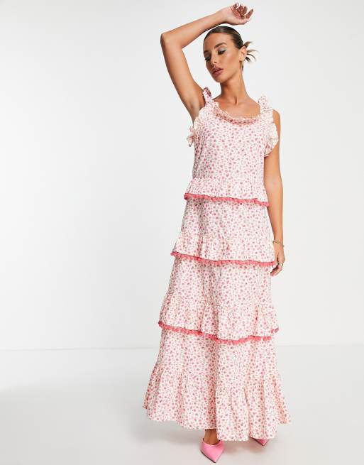 Y.A.S – Rosa, blommig och panelsydd maxiklänning med pompoms