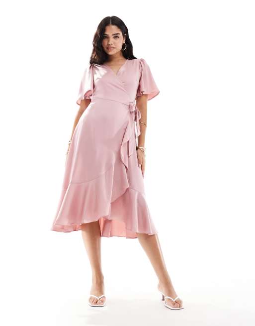 YAS – Rosalila midiklänning med omlottdesign och halvlånga ärmar