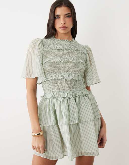 YAS – Salviagrön, randig, smockad miniklänning med volangdetaljer